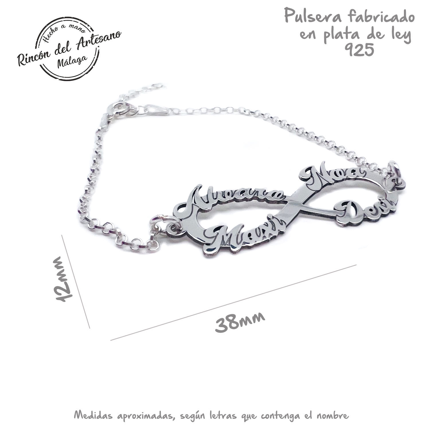 PULSERA INFINITO PERSONALIZADA PARA MUJER CON 4 NOMBRES – PLATA DE LEY 925/1000 – HECHA A MANO EN MÁLAGA – REGALO ESPECIAL DÍA DE LA MADRE Y NAVIDAD MODELO 2025