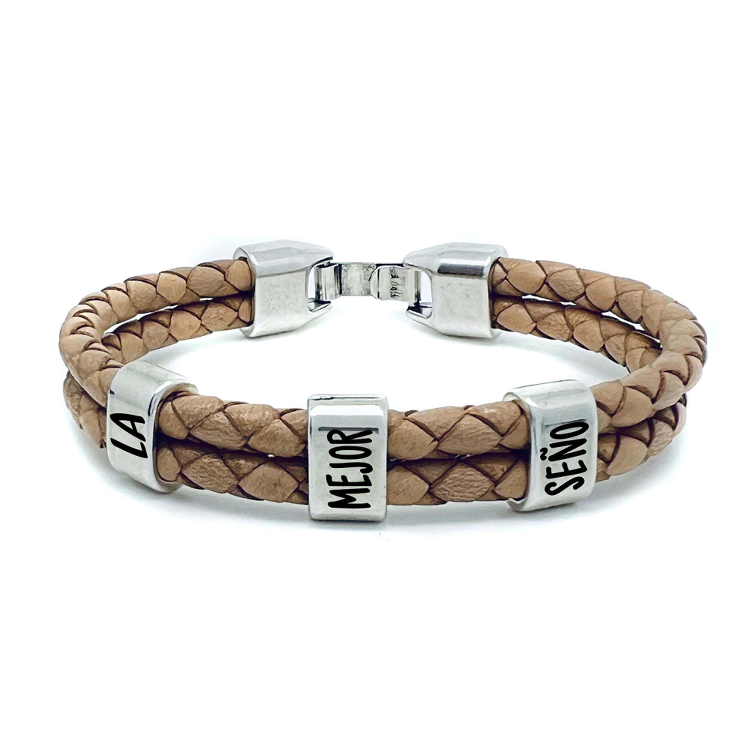 Pulsera para profesores montada en cuero trenzados nacional personalizada con nombres. Piezas fabricadas en Zamak Baño plata. Grabados láser realizados con máquinas exclusivas para el tratamiento del los metales. El mejor regalo para profesores, fin de Curso. Fabricada en nuestro taller de Málaga- RINCÓN DEL ARTESANO
